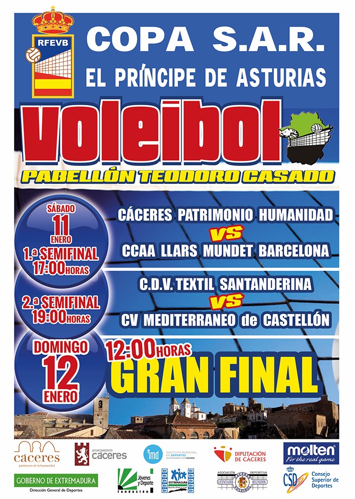 Tras la clasificación para la VII Copa S.A.R. Príncipe de Asturias, la Real Federación Española de Voleibol ha decidido que la sede para la celebración de la próxima edición de la VII SAR Copa Príncipe de Asturias sea la ciudad de Cáceres. El torneo se celebrará los días 11 y 12 de Enero del 2014. Los cuatro equipos clasificados son: CDV Textil Santanderina, CV Mediterráneo de Castellón, CV AA Llars Mundet y Cáceres Patrimonio de la Humanidad.El Gobierno de Extremadura, la Diputación de Cáceres y el Ayuntamiento de Cáceres, junto con la Federación Extremeña de Voleibol, están encantados con que Cáceres acoja el acontecimiento deportivo. Todas las autoridades colaborarán con el Cáceres Patrimonio de la Humanidad en la organización de la VII SAR Copa Príncipe de Asturias